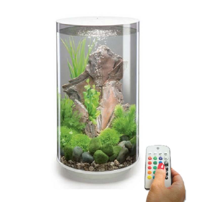 Аквариум из высокопрочного прозрачного акрила, в форме цилиндра с обзором 360°, с цветной подсветкой и пультом. Полностью готов к использованию. Крышка белая. Все, что необходимо для установки аквариума, входит в комплект: