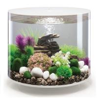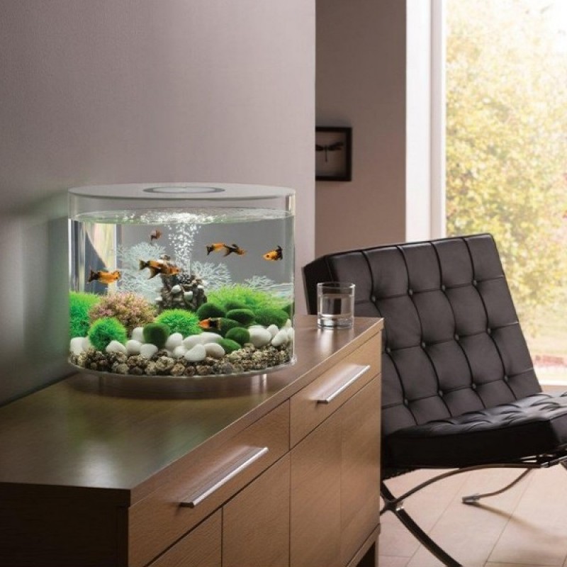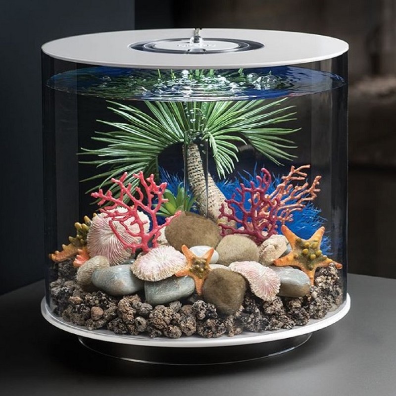 Аквариум из высокопрочного прозрачного акрила, в форме цилиндра с обзором 360°, с белой подсветкой. Полностью готов к использованию. Крышка белая. Все, что необходимо для установки аквариума, входит в комплект: