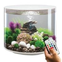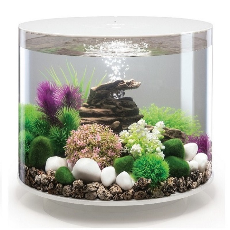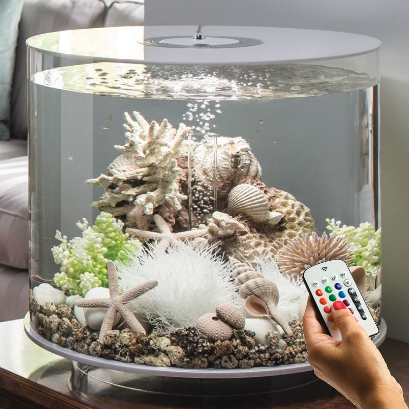 Аквариум из высокопрочного прозрачного акрила, в форме цилиндра с обзором 360°, с цветной подсветкой и пультом. Полностью готов к использованию. Крышка белая. Все, что необходимо для установки аквариума, входит в комплект: