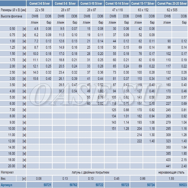 | Высота фонтана | DWB (л/мин) / DDB (бар) |