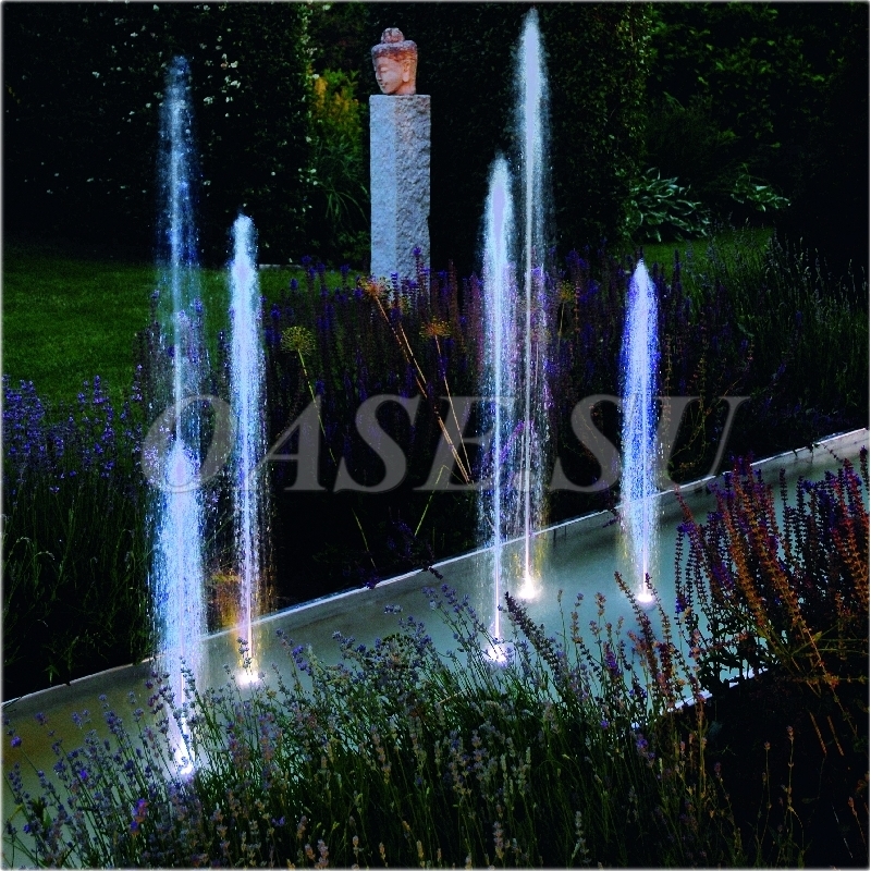 • Записанные программы позволяют регулировать высоту фонтана и интенсивность света, а также воспроизводить все комбинации.