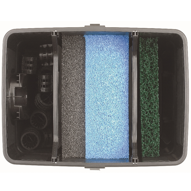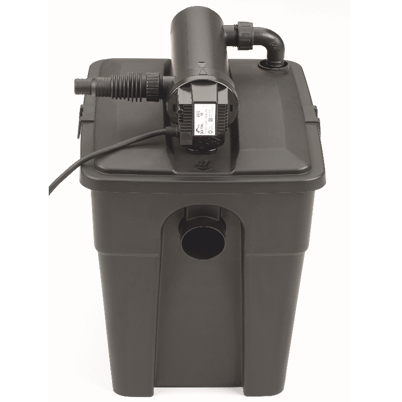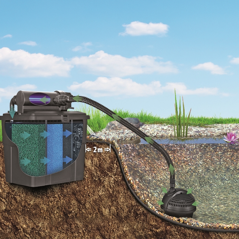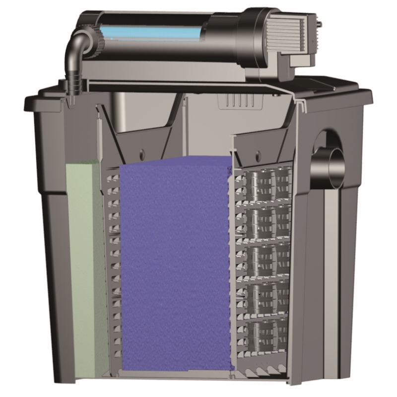Готовые комплекты проточной системы фильтрации используют многоступенчатую - биологическую, механическую и ультрафиолетовую очистки воды в пруду (губки, элементы с биологической активной поверхностью и уф-лампа) Возможна различная установка - выше уровня воды или прикапывается в грунт до уровня слива воды.