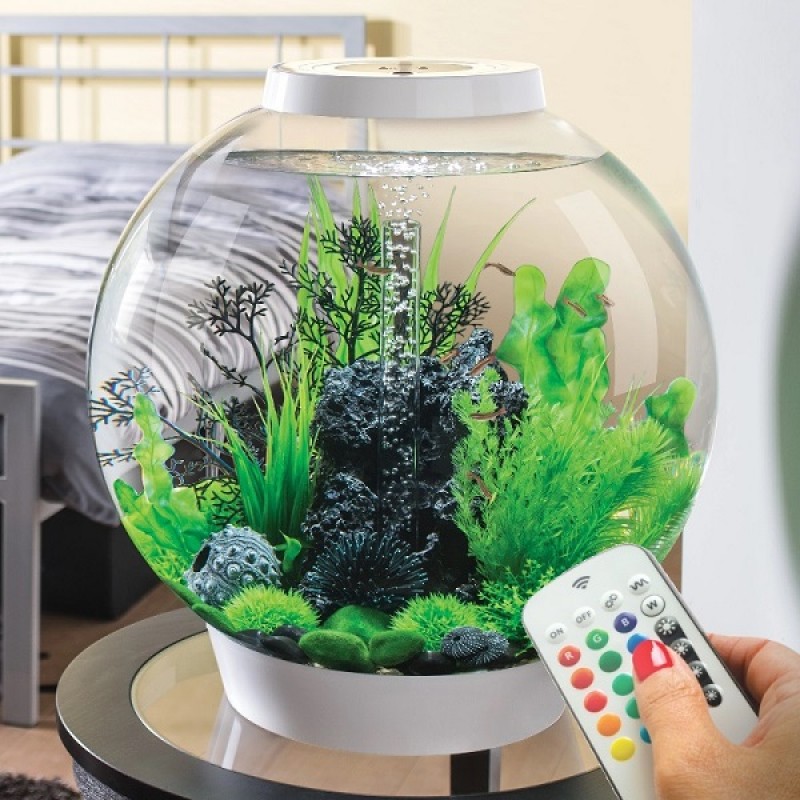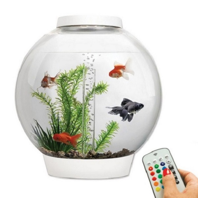 Круглый аквариум из высокопрочного прозрачного акрила с белой подсветкой. Полностью готов к использованию. Крышка белая. Все, что необходимо для установки аквариума, входит в комплект: