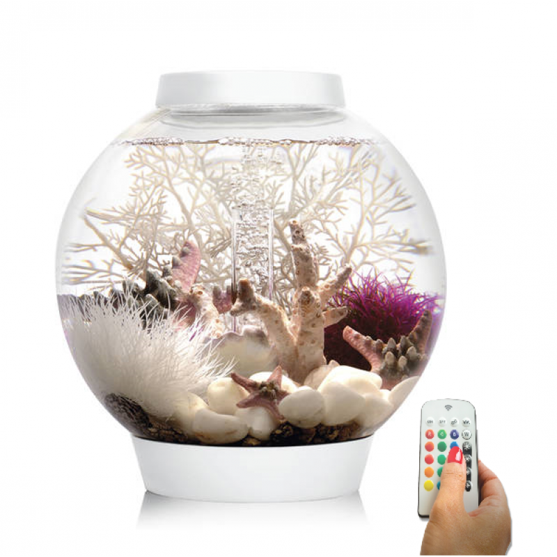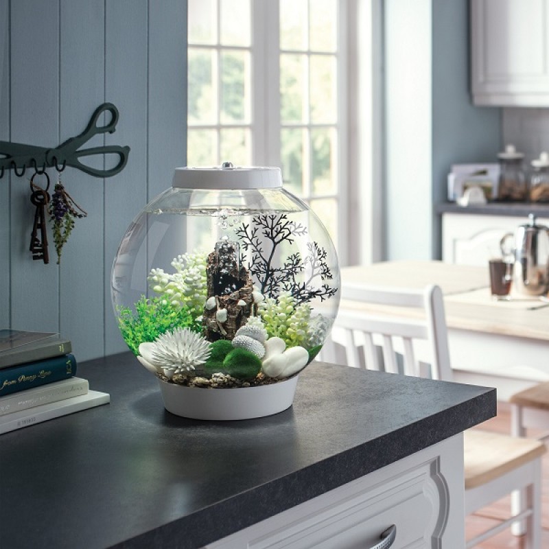 Круглый аквариум из высокопрочного прозрачного акрила с белой подсветкой. Полностью готов к использованию. Крышка белая. Все, что необходимо для установки аквариума, входит в комплект: