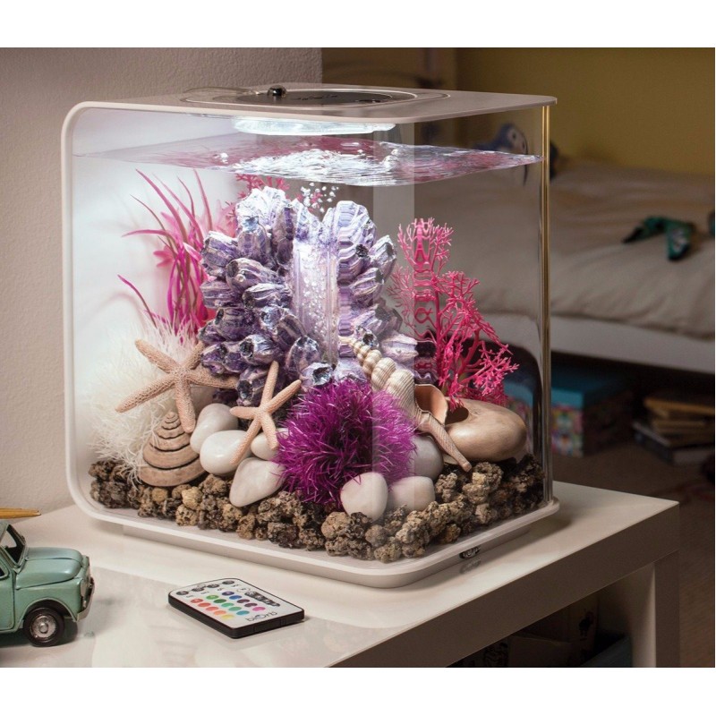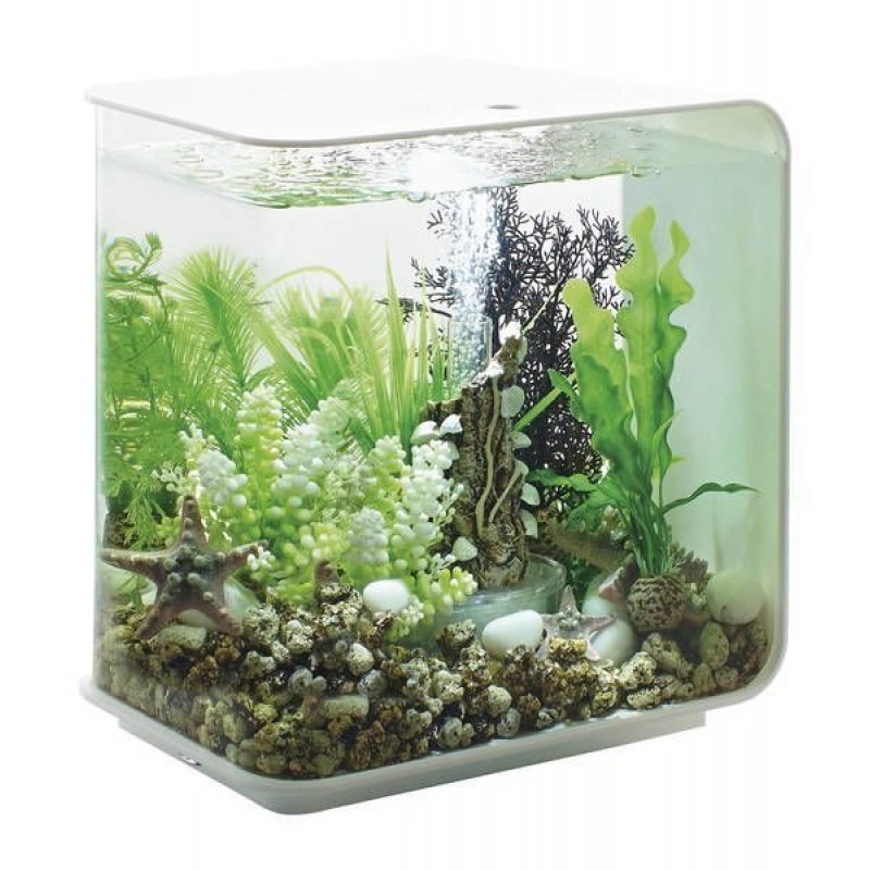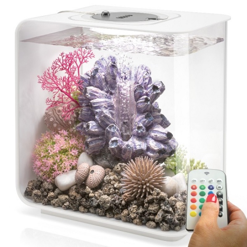 Аквариум из высокопрочного прозрачного акрила, современной формы, с цветной подсветкой и пультом. Полностью готов к использованию. Крышка белая. Все, что необходимо для установки аквариума, входит в комплект: