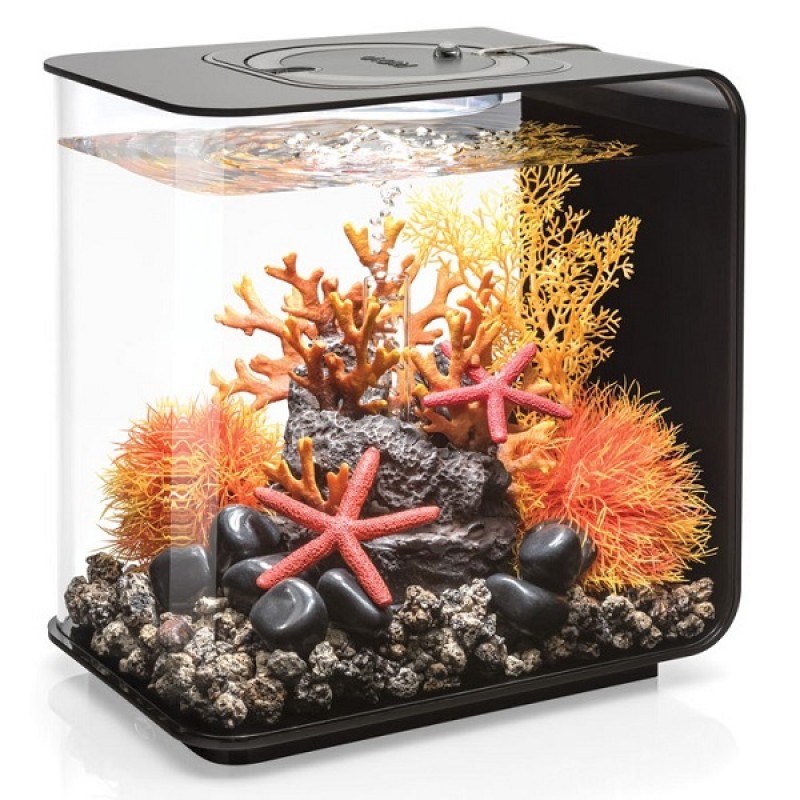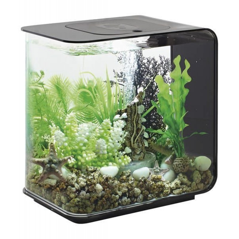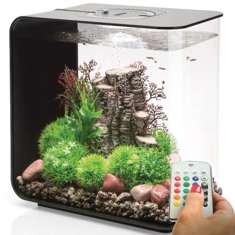 Аквариум из высокопрочного прозрачного акрила, современной формы, с цветной подсветкой и пультом. Полностью готов к использованию. Крышка черная. Все, что необходимо для установки аквариума, входит в комплект: