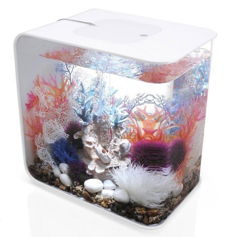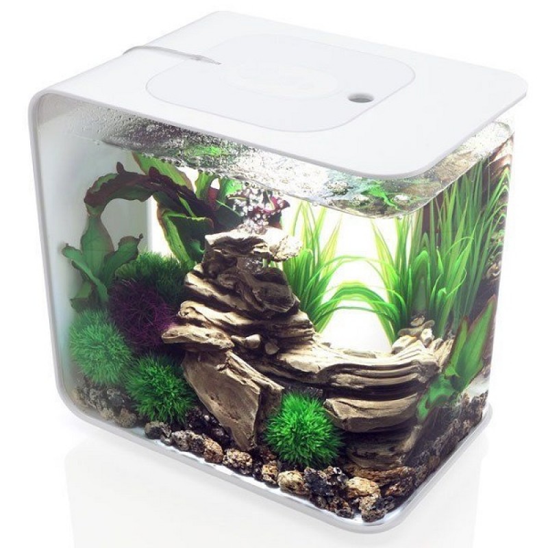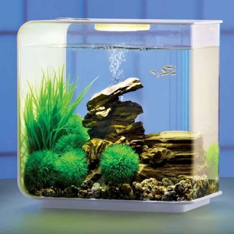 Аквариум из высокопрочного прозрачного акрила, современной формы, с белой подсветкой LED. Обзор с 3х сторон. Полностью готов к использованию. Крышка белая. Все, что необходимо для установки аквариума, входит в комплект: