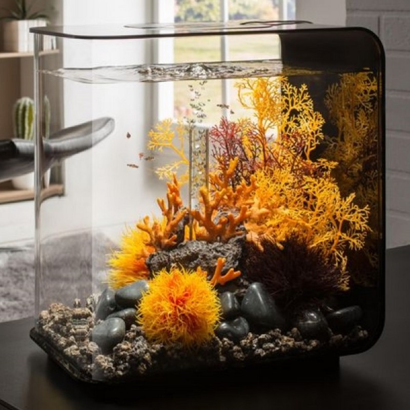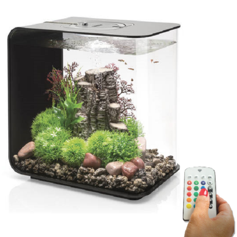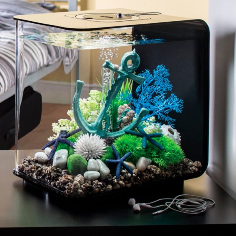 Аквариум из высокопрочного прозрачного акрила, современной формы, с цветной подсветкой и пультом. Обзор с 3х сторон. Полностью готов к использованию. Крышка черная. Все, что необходимо для установки аквариума, входит в комплект: