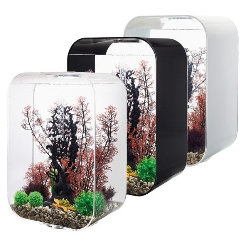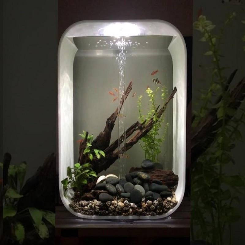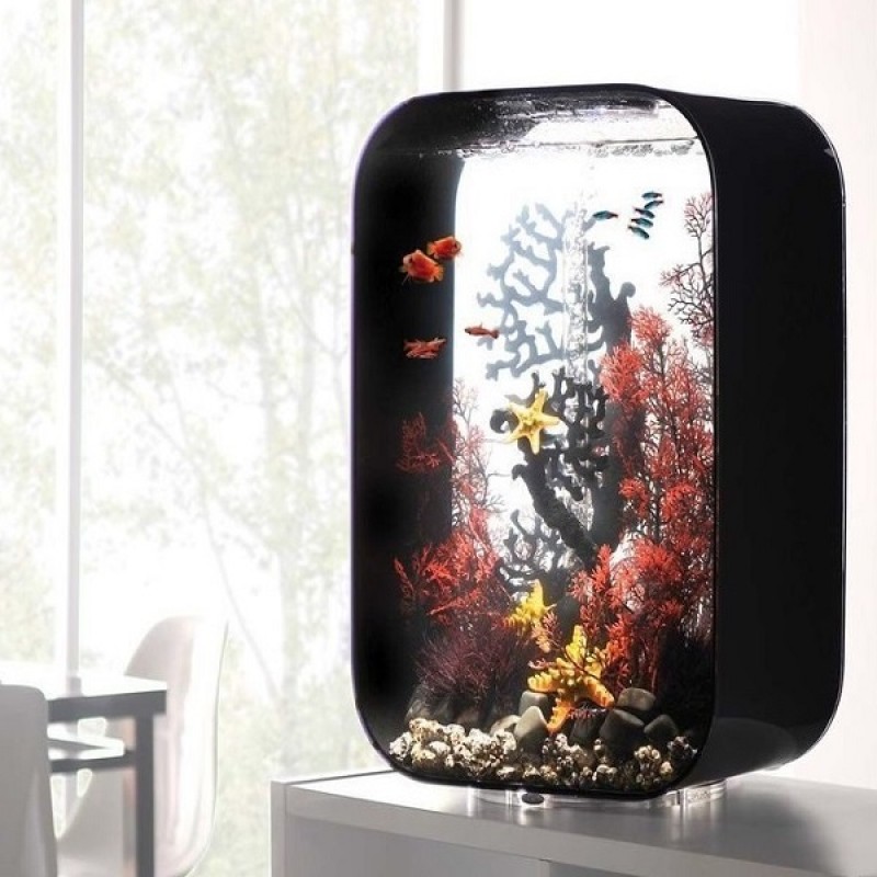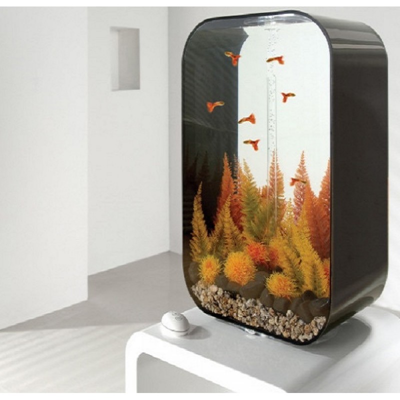 Аквариум из высокопрочного прозрачного акрила, современной формы, с цветной подсветкой и пультом. Полностью готов к использованию. Крышка черная. Все, что необходимо для установки аквариума, входит в комплект: