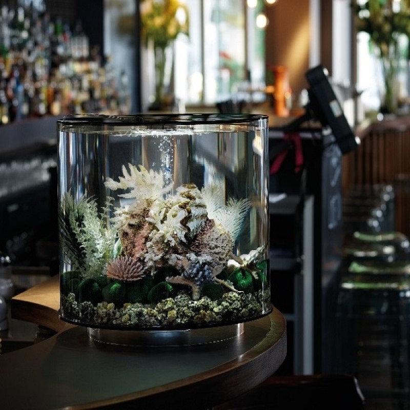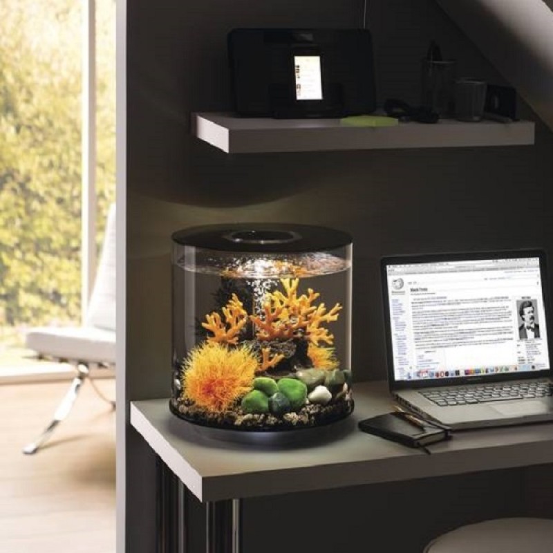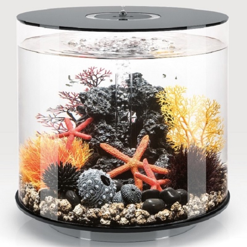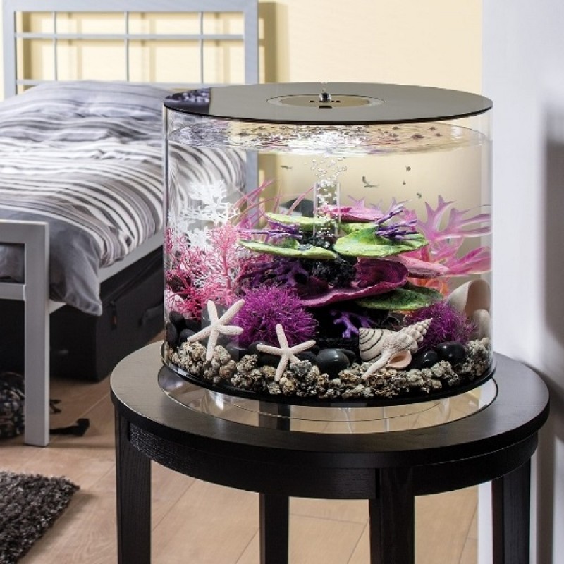 Аквариум из высокопрочного прозрачного акрила, в форме цилиндра с обзором 360°, с белой подсветкой. Полностью готов к использованию. Крышка черная. Все, что необходимо для установки аквариума, входит в комплект: