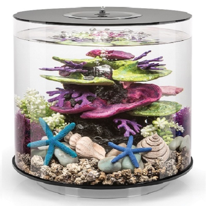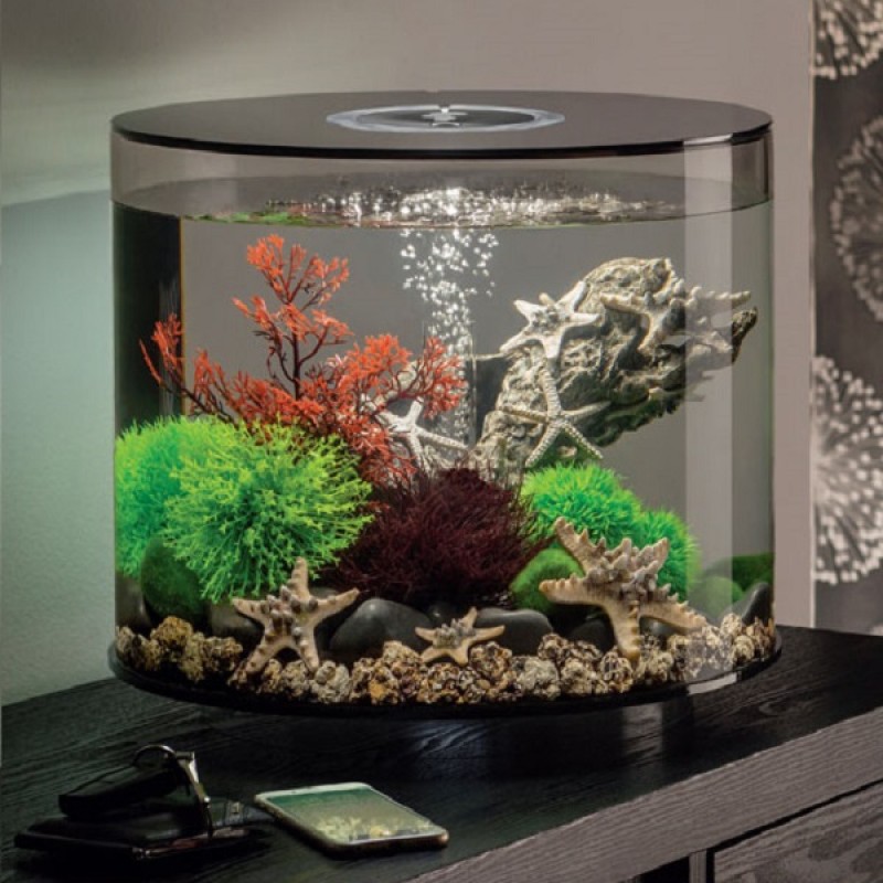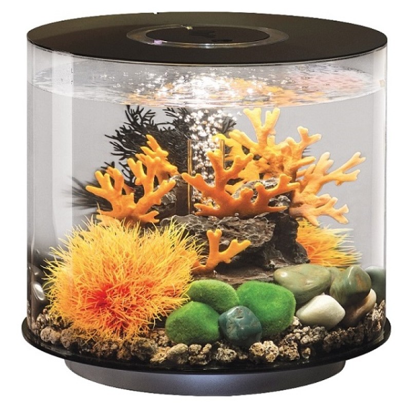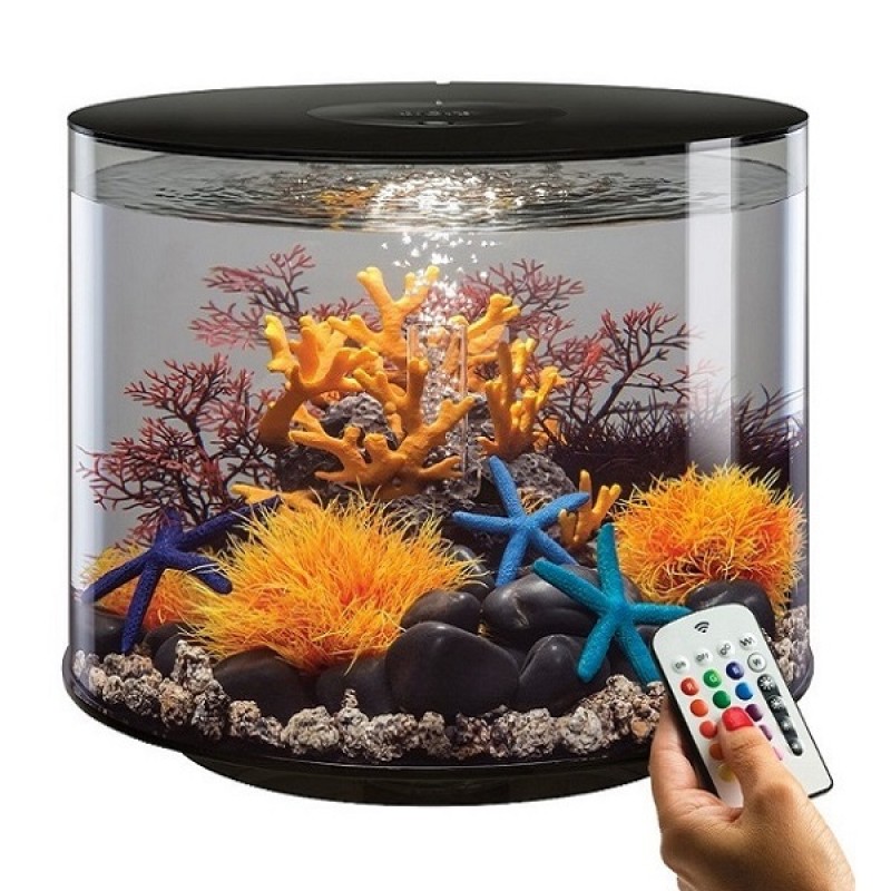 Аквариум из высокопрочного прозрачного акрила, в форме цилиндра с обзором 360°, с цветной подсветкой и пультом. Полностью готов к использованию. Крышка черная. Все, что необходимо для установки аквариума, входит в комплект: